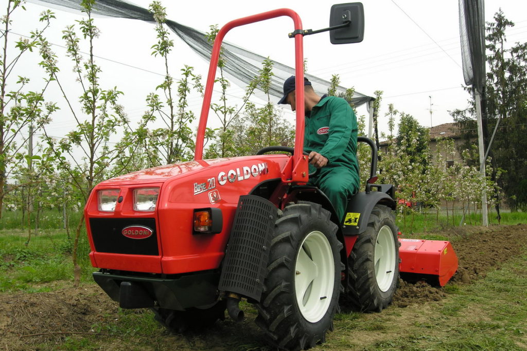Goldoni cuenta con una variada línea de tractores especiales, diseñados para atender las demandas de cultivos regionales, como el modelo ultracompacto Base 20, de sólo 80 cm de ancho, con chasis articulado y formato de cuatro ruedas iguales.